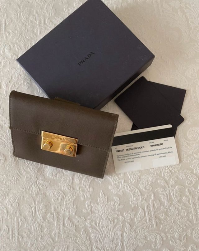Dettagli del prodottoPortafoglio in tela vela con interno in pelle saffiano color marrone bruciato. All'interno vano per banconote, card e documenti. Sul davanti importante chiusura dorata per contenere le monete. Abbinabile la borsa della stessa linea. Ottimo stato, qualche piccolo segno ma nulla di evidente da segnalare. Completo di card e scatola. Misure da chiuso 12x9
