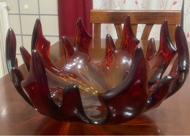 Dettagli del prodottoElegante portafrutta o centrotavola in vetro di Murano, con un design a lingua di fuoco.