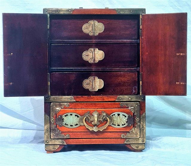 Dettagli del prodottoPortagioie Cinese antico In Legno di mogano, Giada E Ottone Realizzato A Mano datato 1960.