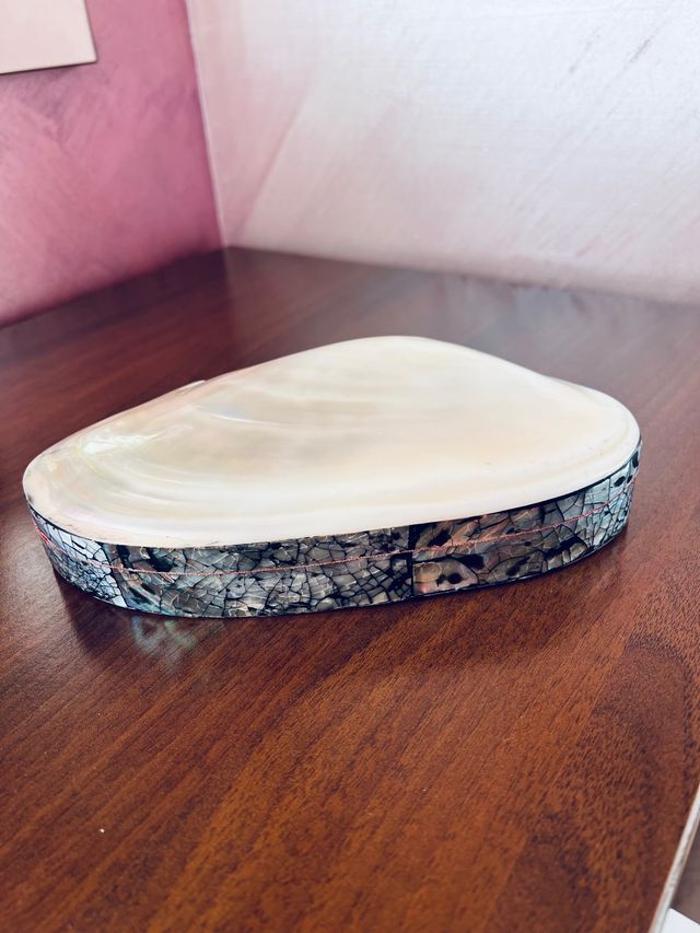 Meravigliosa scatola in madreperla, finemente intarsiata sotto e di lato e con il coperchio formato da una bellissima conchiglia. L’interno è interamente rivestito in velluto rosso.