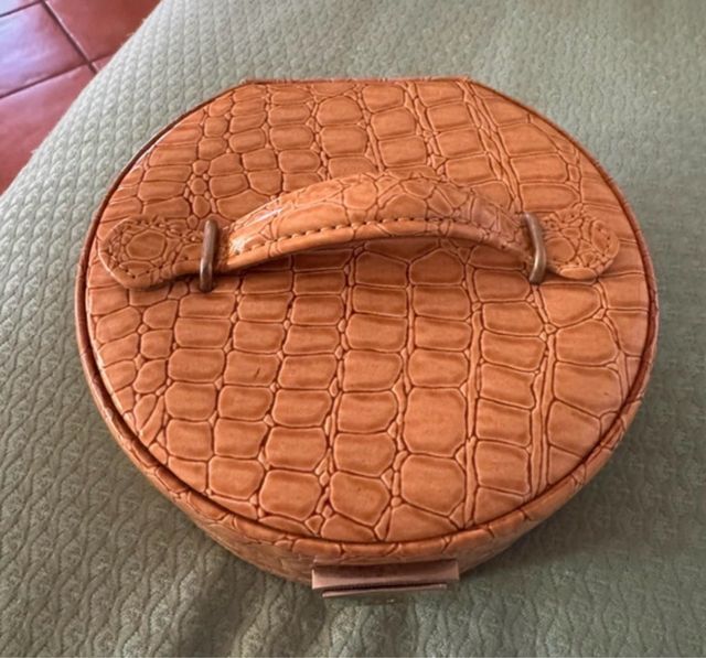 Elegante portagioie rotondo con una finitura che imita la pelle di coccodrillo.
