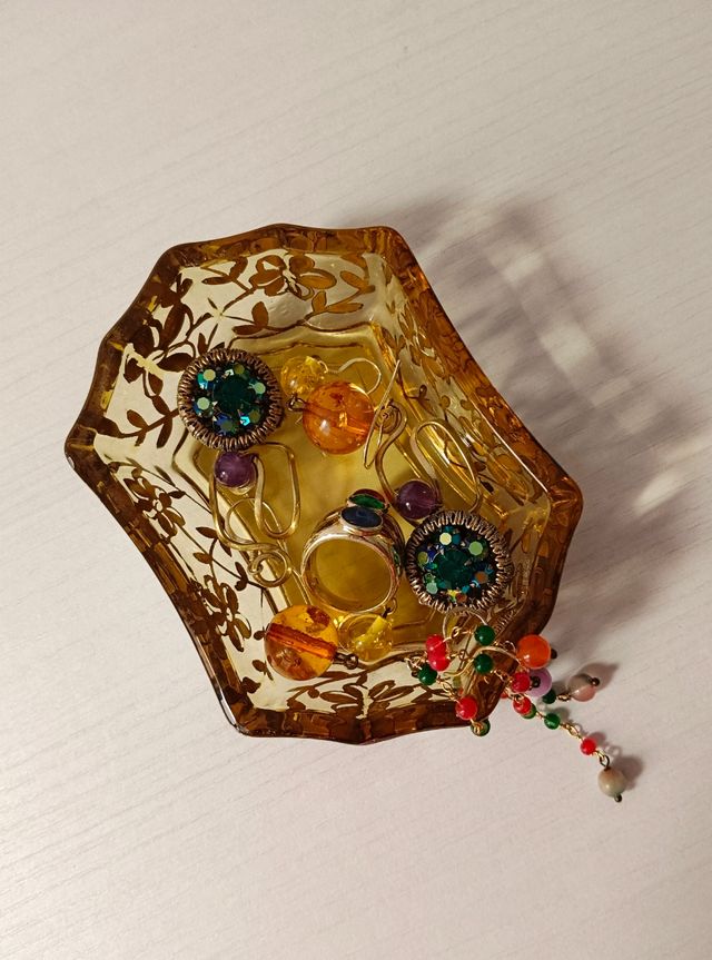 Raffinata ciotola portagioie anni '50 in vetro color ambra finemente decorata. Condizioni ottime con normali segni del tempo.