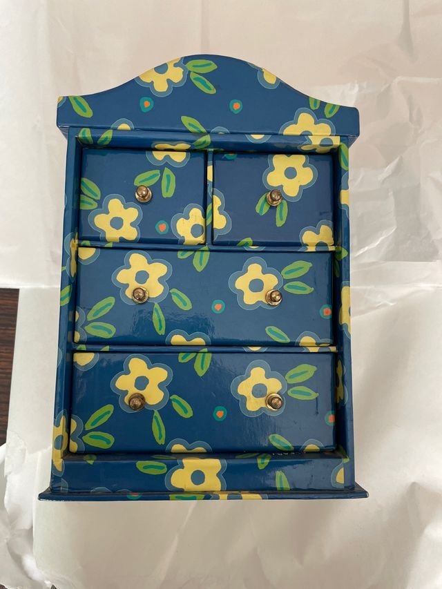 Portaoggetti a fantasia a fiori. Materiale: cartone rigido Colore: blu con fiori gialli