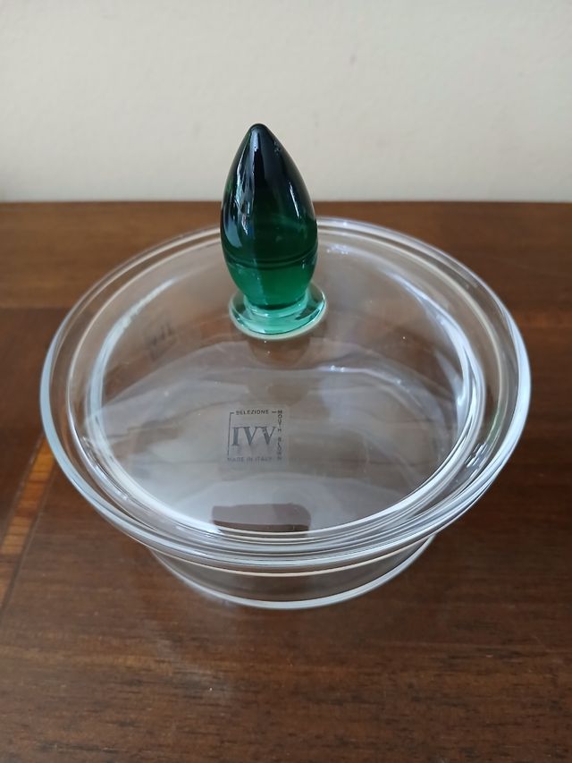 Dettagli del prodottoBellissimo portaoggetti della IVV, in vetro trasparente con coperchio. Il tappo è in vetro verde scuro, a forma di goccia. - Perfetto per conservare piccoli oggetti. - Realizzato in Italia. - In ottime condizioni. Misure del prodotto