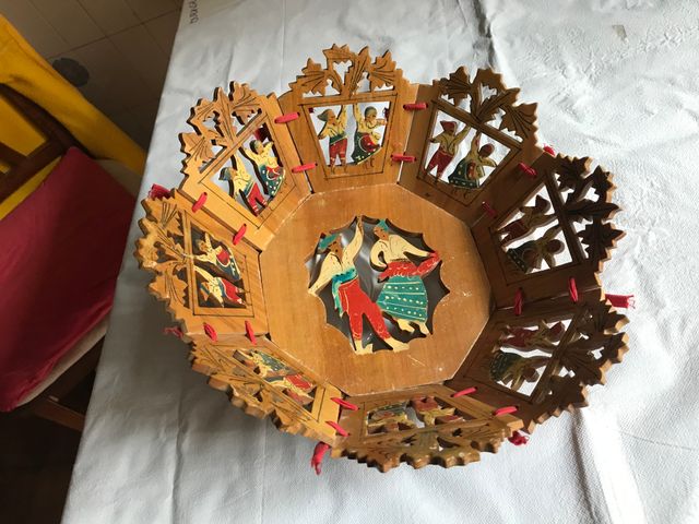 Dettagli del prodottoIl diametro complessivo è di 30 cm, quello della base di 18 e questo è davvero un oggetto molto particolare e che non si vede facilmente in giro. Otto elementi decorati con i classici due ballerini in abiti popolani sono uniti da nastrini rossi a formare un ottagono che si incastra perfettamente nella base a comporre cosi un cestello per il pane. Qualche segno del tempo sul legno ma davvero un oggetto imperdibile ! Non sono certissimo della provenienza sorrentina, anche se l'area di provenienza è quella. Spedisco in Italia al costo di euro 10. Contatti su Wallapop
