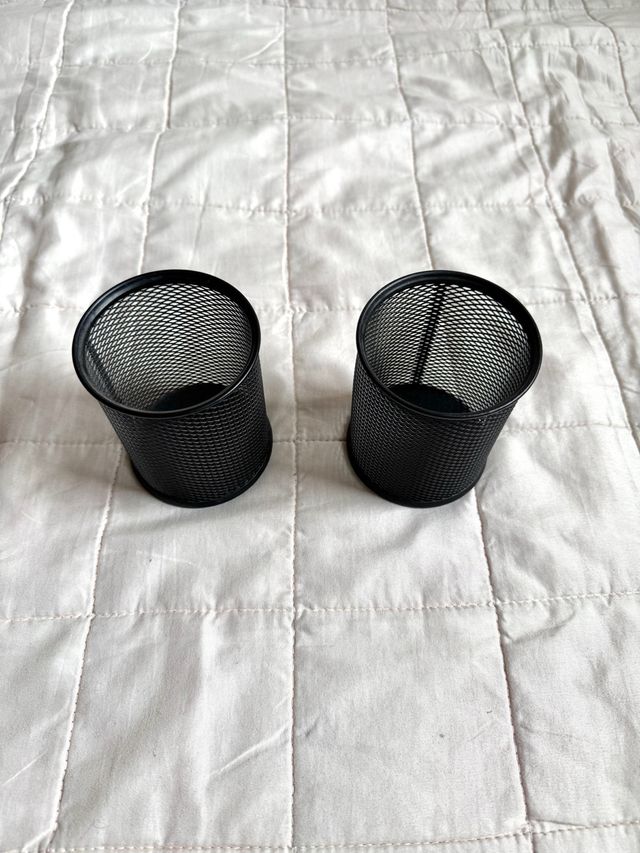Dettagli del prodottoSet di due porta penne in rete metallica nera. Perfetti per organizzare la scrivania.