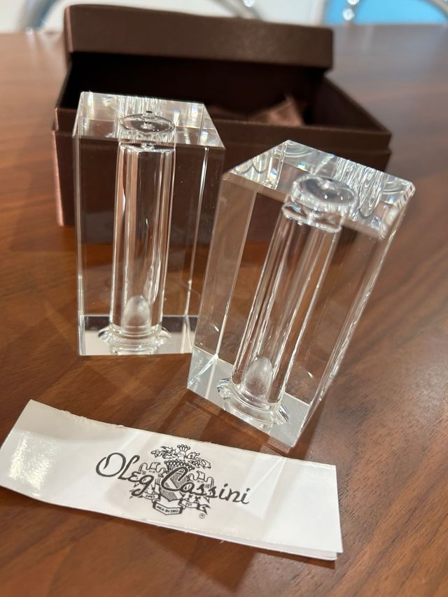 raffinatissimi portasale e portapepe in vero cristallo firmati Oleg Cassini. nuovi, mai usati, ancora nella loro scatola.