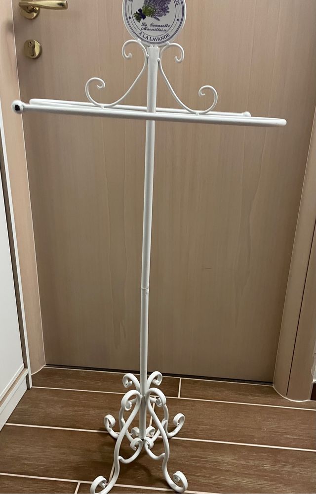Dettagli del prodottoPortasciugamani bianco, mod. Shabby Chic, misure: h 107 cm, largo 44 cm….. usato per pochissimo tempo, presenta solo una piccola scrostatura (visibile in foto) facilmente riparabile.
