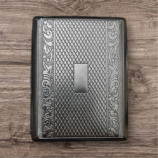 Dettagli del prodottoElegante portasigarette in metallo con un design che ricorda lo stile vintage. Presenta una trama a rombi al centro, affiancata da decorazioni floreali sui lati e un rettangolo centrale liscio.