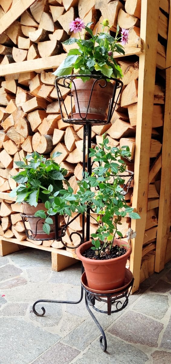Splendido portavasi in ferro battuto. Lavorazione artigianale. Elegante e pratico. Misura circolare, con tre posti per i vasi ad altezze diverse.