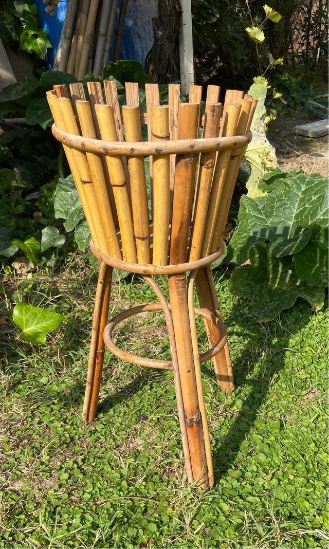 Dettagli del prodottoPorta vaso vintage in bambù naturale con gambe e rinforzi, listelli e cerchi. altezza totale cm.49, diametro massimo al bordo cm.22, diametro interno alla base cm.12, altezza interna vaso cm. 17. alcuni segni di usura alle gambe visibili in foto.
