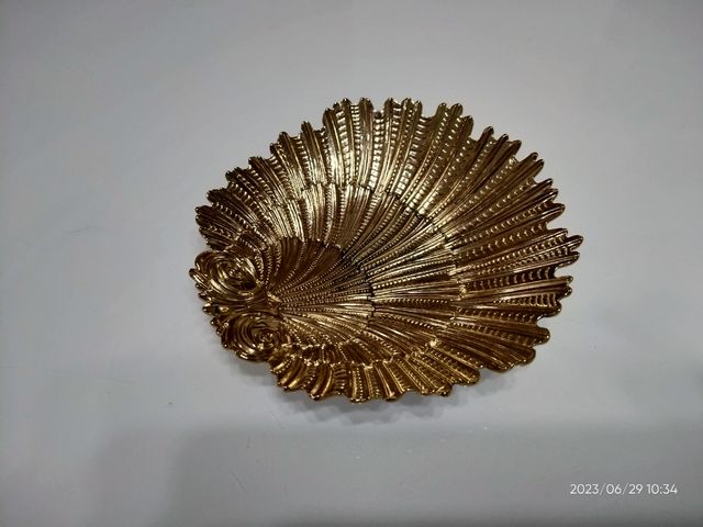 Dettagli del prodottoElegante posacenere in metallo dorato a forma di conchiglia, firmato da Enzo Miccio. Descrizione come da fotografie.