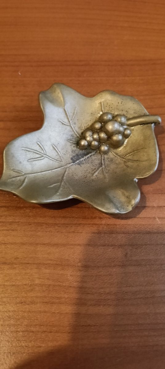 Dettagli del prodottoBellissimo posacenere vintage in bronzo, a forma di foglia d'uva. Ideale per un tocco di eleganza retrò.