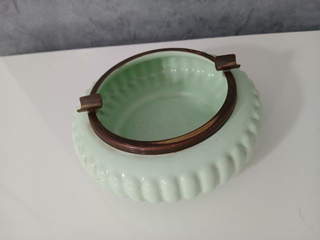 Dettagli del prodottoElegante posacenere in ceramica verde con dettagli in ottone.