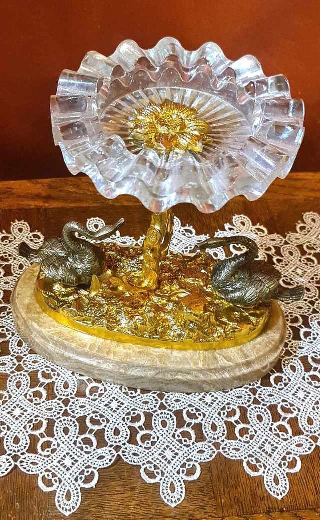 Dettagli del prodottoAntica scultura in bronzo/ottone con base in marmo e posacenere in cristallo