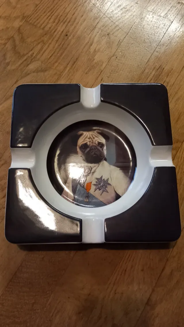Dettagli del prodottoElegante posacenere con un'originale stampa di un cane in abiti d'epoca.