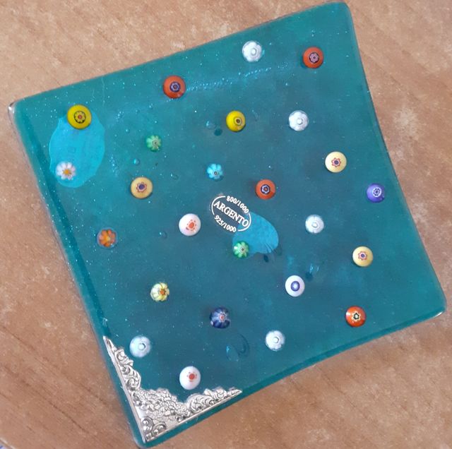 Dettagli del prodottoSvuotatasche in vetro di Murano azzurro mare, con piccole applicazioni colorate e bordo in argento. Nuovo, mai utilizzato. Misure del prodotto