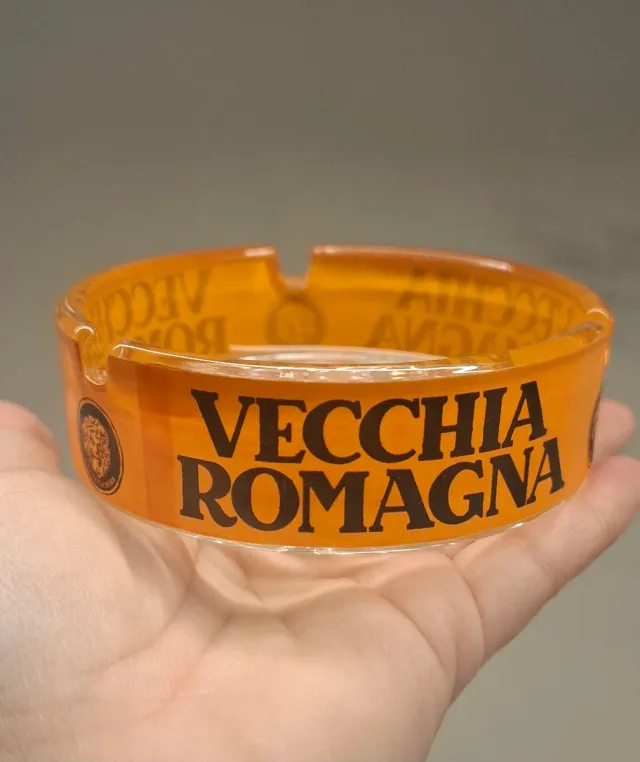 Dettagli del prodottoSplendido posacenere vintage in vetro di colore arancione intenso, con logo nero "Vecchia Romagna" ben visibile. Oggetto originale da collezione, gadget pubblicitario di un noto brandy italiano, probabilmente risalente agli anni '70 o '80.