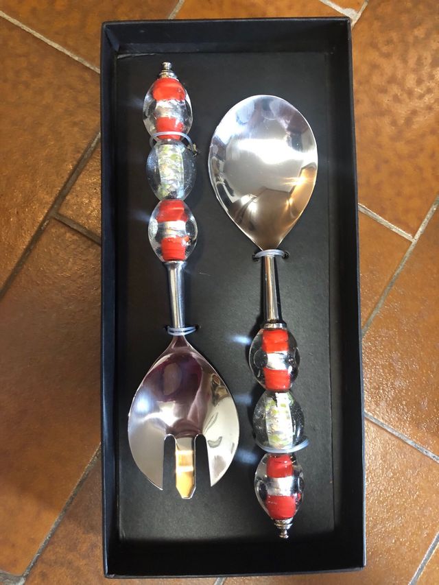 Cucchiaio e forchetta per servire, con manico in vetro tipo murrina.