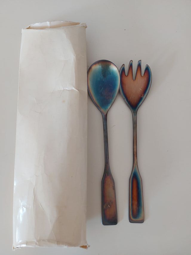 Dettagli del prodottoCoppia di posate per insalata (cucchiaio e forchetta) in argento Sheraton Silver plate. Sulle posate è stampigliato il marchio Sheraton. Presentano segni di ossidazione. Da pulire e lucidare.