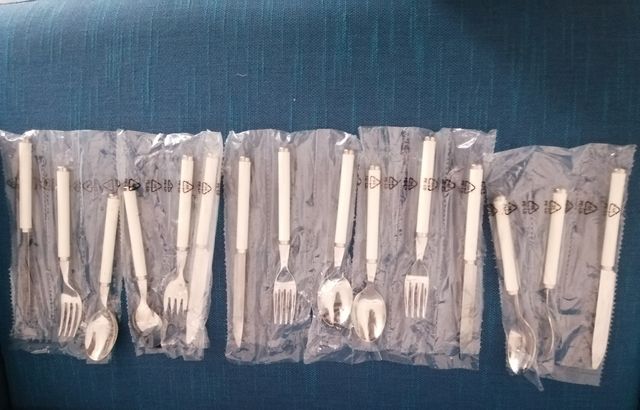 Set posate nuovi con cartellino 3x5set forchette cucchiai e coltelli con manico rigido bianco lucido madreperla