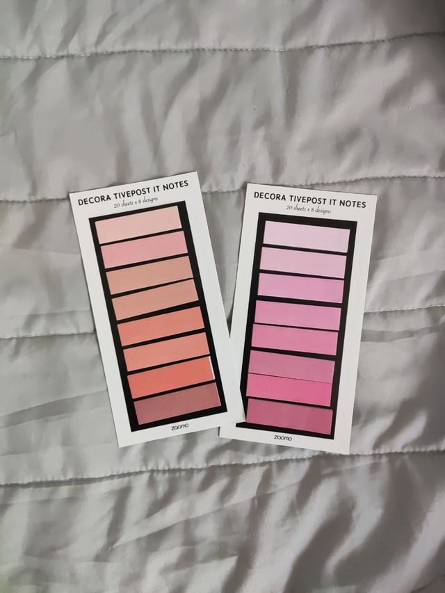 Due blocchi di post-it, ciascuno ha 8 colori diversi e 20 foglietti di dimensione 4,5 x 1,2 cm per ogni colore.