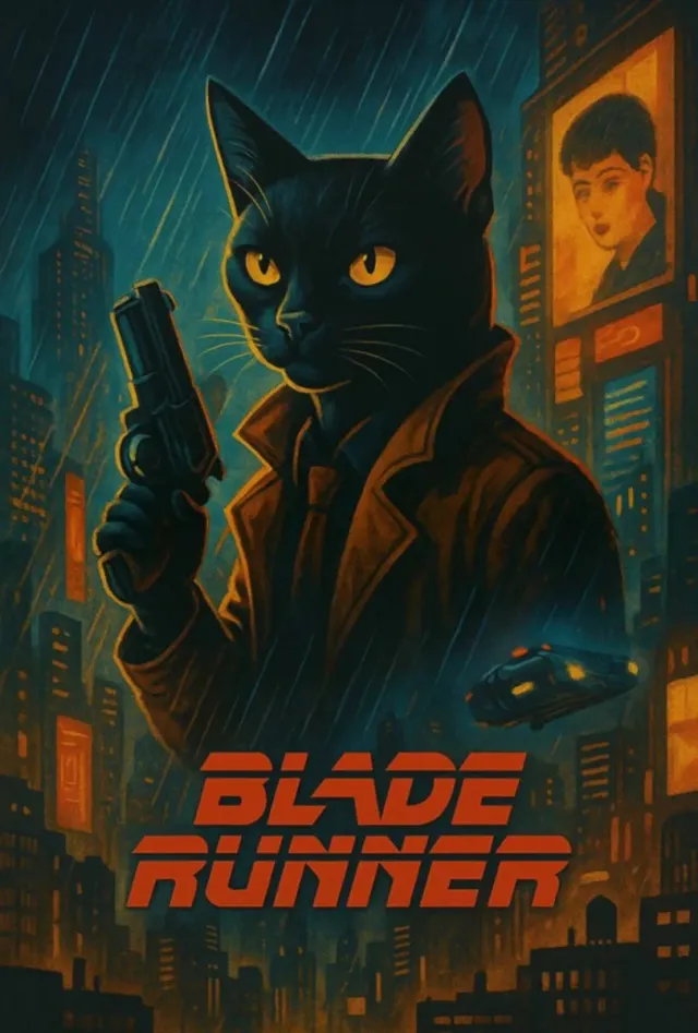 Poster ispirato al film Blade Runner con un gatto nero protagonista. - Stile artistico unico. - Ambientazione urbana notturna e piovosa. - Elementi iconici del film.