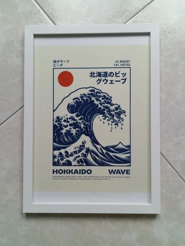 Dettagli del prodottoPoster con un design ispirato alle onde giapponesi, raffigurante una grande onda blu con il sole rosso e montagne sullo sfondo. Il testo HOKKAIDO WAVE è presente in basso.