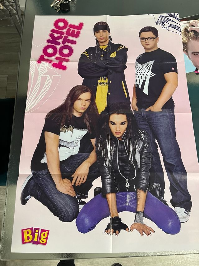 Poster dei Tokio Hotel con il cantante Bill Kaulitz in primo piano. - Grafica con sfondo rosa. - Logo Big in basso a sinistra.