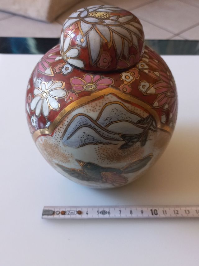 Potiche orientale vintage con decoro uccelli e fiori. 12 cm per 17cm di altezza circa. Nessuna rottura o sbeccatura. Marchio sul fondo