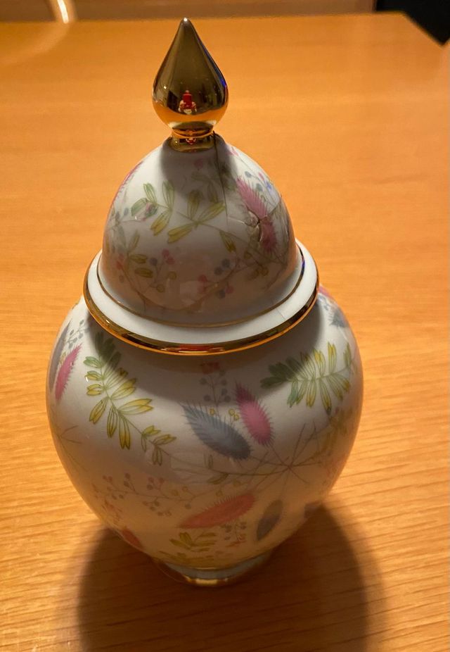 Dettagli del prodottoAntico Vaso potiche in Schlottenhof Bavaria fine porcellana smaltata decorato a tema floreale su sfondo bianco. Le rifiniture e il puntale del coperchio sono a bagno di oro zecchino. Marchiato sul fondo col marchio della prestigiosa e storica fabbrica tedesca di porcellane e ceramiche Porzellanfabrik Schlottenhof. Non in perfetto stato perché rotto il coperchio e aggiustato quasi alla perfezione con colla. Evidenti segni di colla sul coperchio nella parte di chiusura (vedi foto per rottura aggiustata e per colla).
