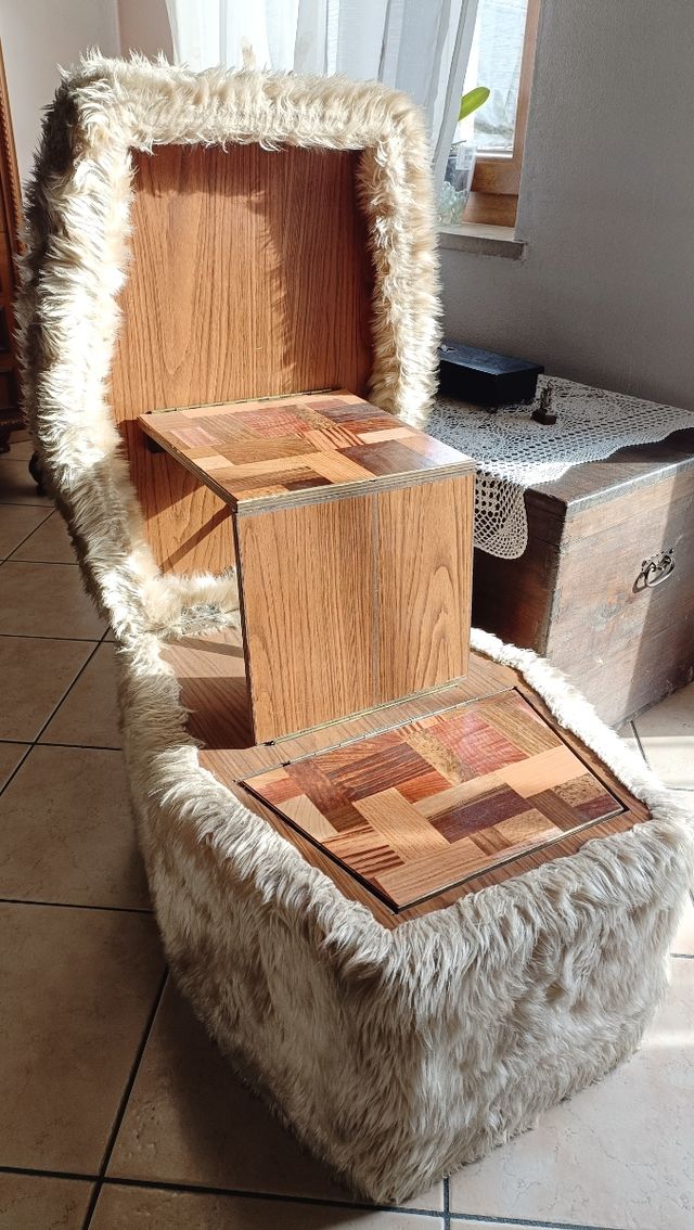 Dettagli del prodottoOriginale e particolare pouf anni '70 con pelo di floccato, color bianco avorio, con coperchio apribile, contenitore interno e scaletta. Ottime condizioni vintage. Il pelo, ancora molto bello, eventualmente da lavare a vapore.