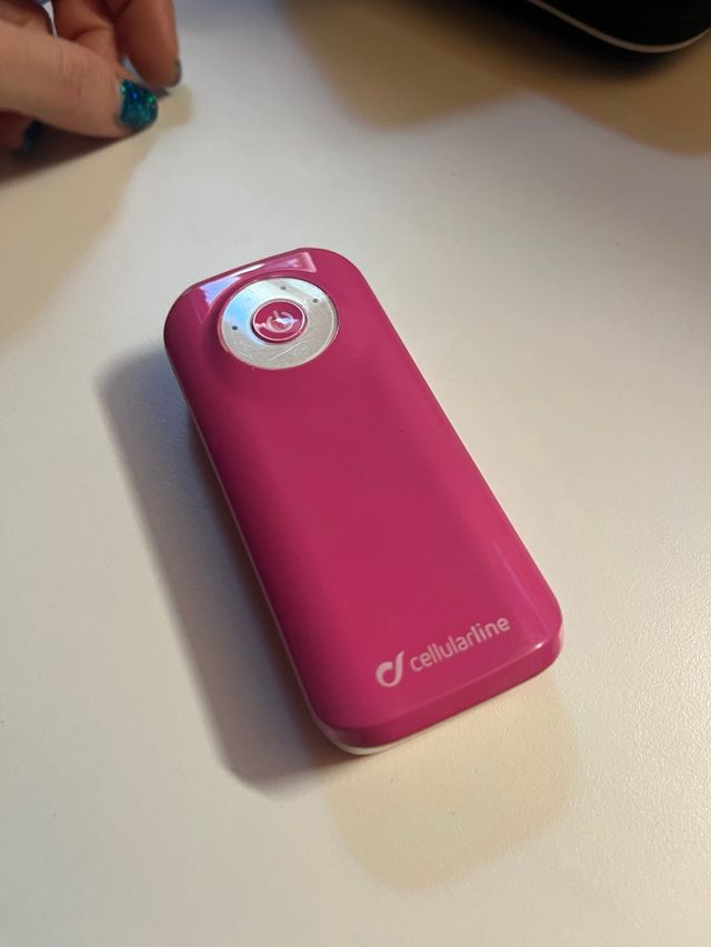 Caricabatterie portatile di colore rosa. - Due porte USB per la ricarica. - Design compatto e pratico.
