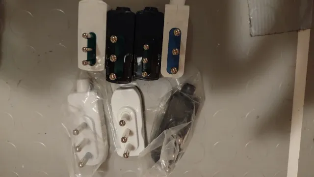 Set di prese elettriche triple, ideali per diverse esigenze. - Colori assortiti: bianco, nero e con dettagli blu. - Design a tre pin.