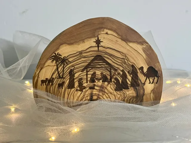 Dettagli del prodottoBellissimo presepe realizzato in legno d'ulivo, con una scena della Natività finemente intagliata.