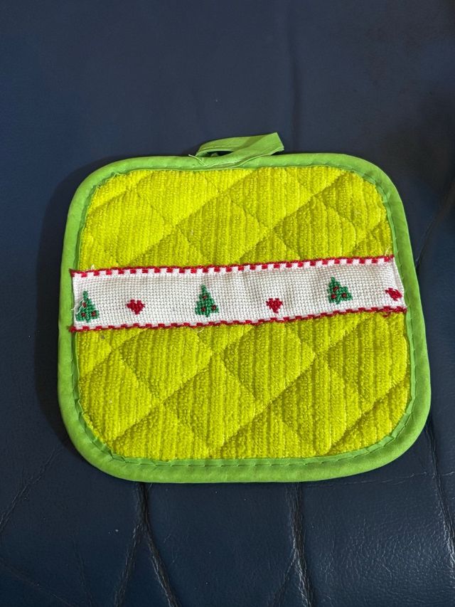 Dettagli del prodottoPresina imbottita con un design a rombi e un nastro decorativo. Perfetta per proteggere le mani.