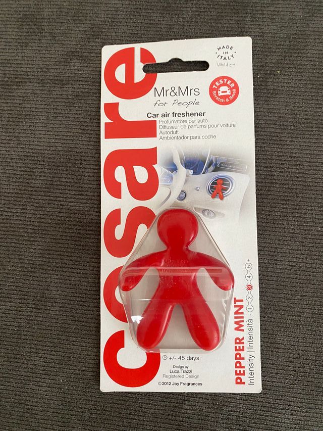 Dettagli del prodottoCesare di Mr&Mrs è un profumatore per auto adattabile a tutti i tipi di macchine da inserire nelle griglie delle bocchette di aerazione. Contiene una molecola aggressiva per contrastare i cattivi odori, anche persistenti, per un effetto a lunga durata, con oli essenziali che profumano tutto l'abitacolo. Si può utilizzare anche in casa o negli armadi, come profumatore per l'ambiente. È un profumatore usa e getta, con una durata di 45 giorni circa. Cesare rosso ha la fragranza "pepper mint" menta piperita (famiglia olfattiva: fiorita fruttata). Materiale: Polimero termoplastico EVA atossico, 6x8x4 cm, Made in Italy. Nuovo e sigillato