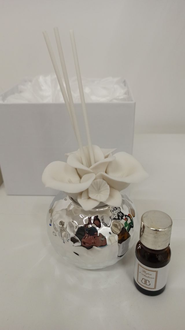 Profumatore in argento e ceramica, con rose bianche e bacchette, con profumo liquido, nuovo con scatola, marca Bongelli Preziosi