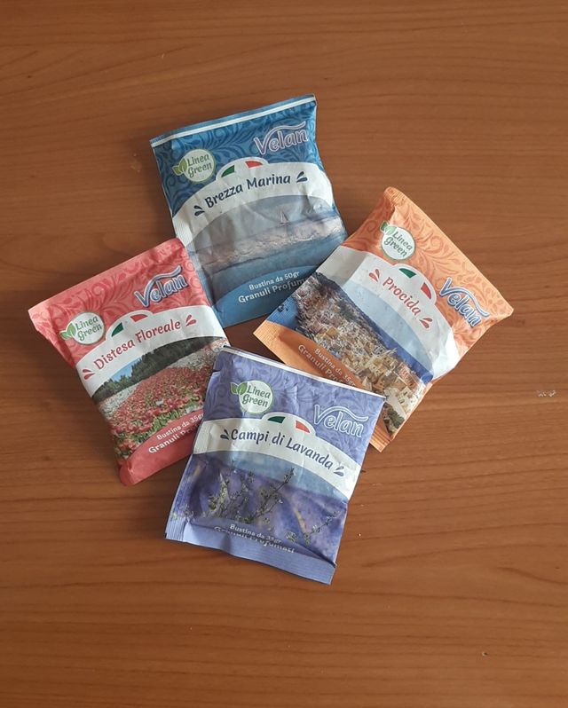Profumatori in grani, 4 fragranze ,ideale per aspirapolveri, profuma armadi e cassetti, ambienti e auto. Kit 4 pezzi € 5,00