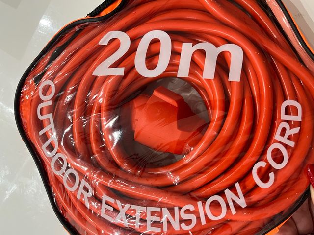 Cavo di prolunga elettrica di colore arancione, ideale per uso esterno. - Lunghezza: 20 metri. - Spina e presa. - Adatto per esterni.