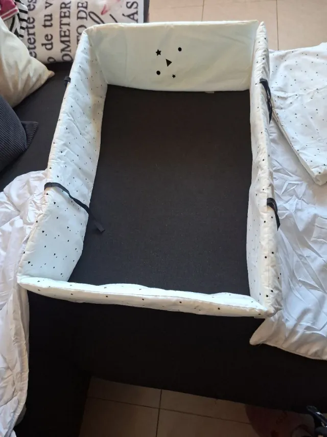Dettagli del prodottoProiettore per mini culla con un design di stelle. - Tessuto bianco con stampa di stelle nere. - Decorazione a forma di orso nella parte superiore. - Fascette di fissaggio nere. La descrizione è stata tradotta automaticamente.
