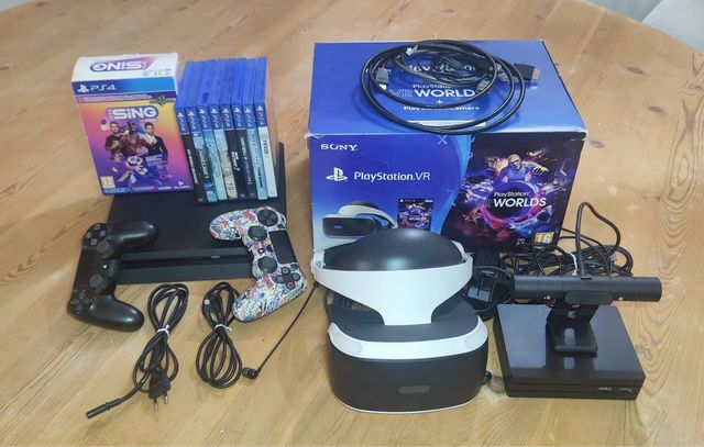Dettagli del prodottoConsola PlayStation 4 con accessori e giochi. Include casco PlayStation VR, due controller DualShock 4 (uno nero e uno personalizzato), gioco Let's Sing per PS4, otto giochi aggiuntivi per PS4, volante con pedali, fotocamera PlayStation e cavi di connessione. La descrizione è stata tradotta automaticamente.