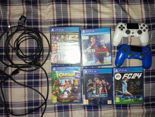 Dettagli del prodottoPacchetto di accessori e giochi per PlayStation 4. Include due controller PS4, cavo di ricarica per controller, Grand Theft Auto V (Premium Edition), PES 2018, Crash Bandicoot N. Sane Trilogy, Jump Force, EA Sports FC 24. La descrizione è stata tradotta automaticamente.