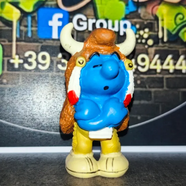 Dettagli del prodottoPersonaggio dei Puffi vestito da indiano con copricapo e pelliccia.