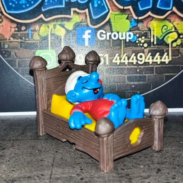 Dettagli del prodottoMiniatura di Puffo che dorme nel suo letto.