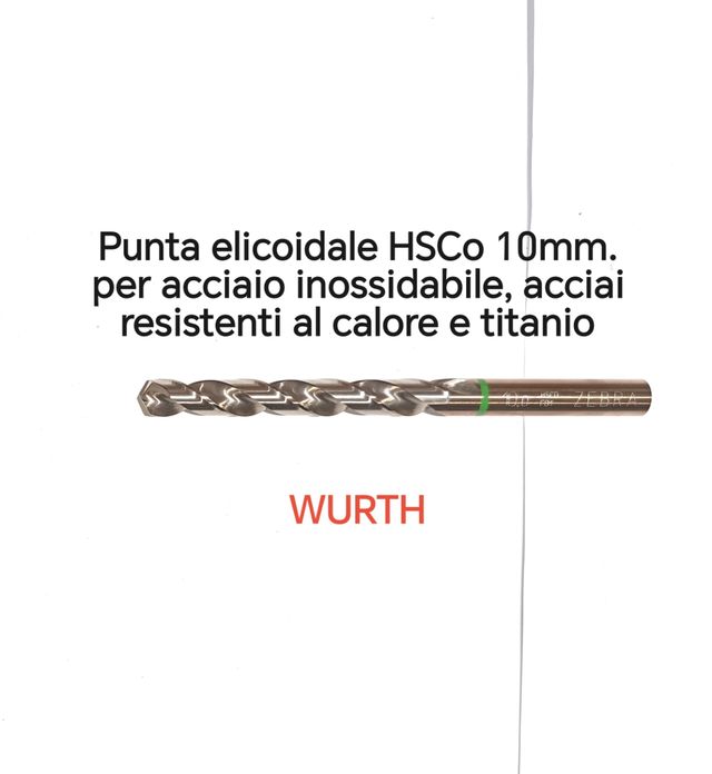 Dettagli del prodottoPunta elicoidale in metallo duro HSCo (High Speed Steel Cobalt) da 10mm del marchio Wurth, modello Zebra. Perfetta per acciaio inossidabile, acciai resistenti al calore e titanio. - Diametro: 10 mm - Materiale: HSCo (High Speed Steel Cobalt) - Marca: Wurth - Modello: Zebra