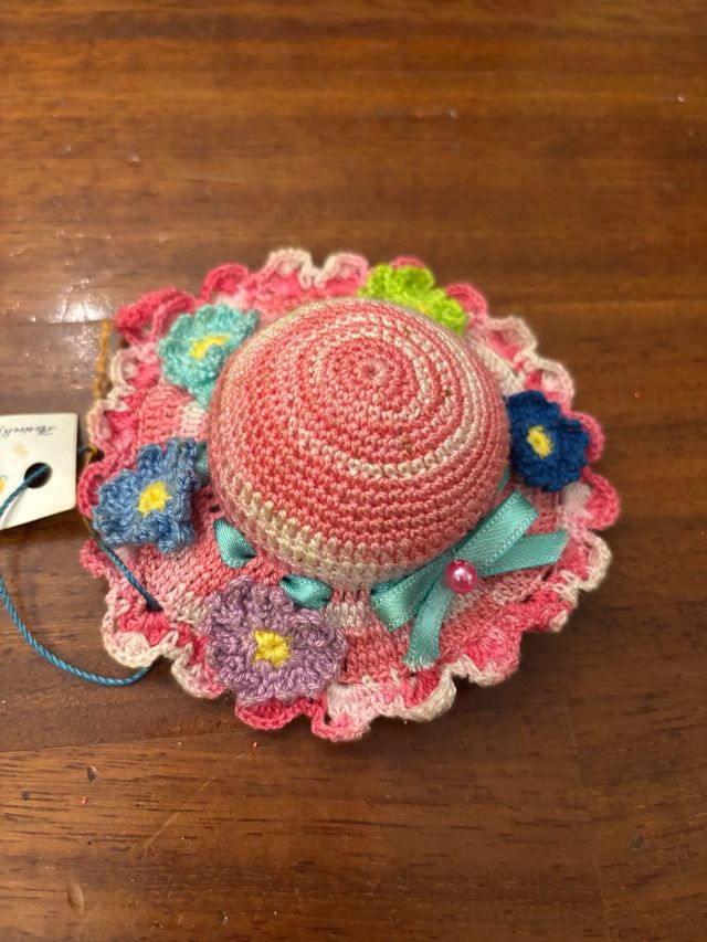 Delizioso puntaspilli realizzato all'uncinetto a forma di cappello. - Decorato con fiori colorati. - Dettagli con nastrino e perla.