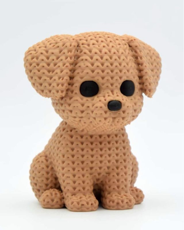 Pupazzo a forma di cane, realizzato con stampa 3D. - Design a maglia. - Colore beige. - Materiale plastica