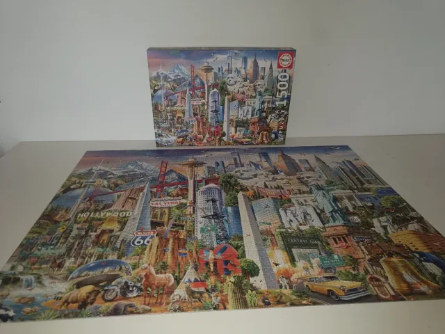 Dettagli del prodottoPuzzle di 1500 pezzi con una vibrante illustrazione di città e monumenti iconici degli Stati Uniti.