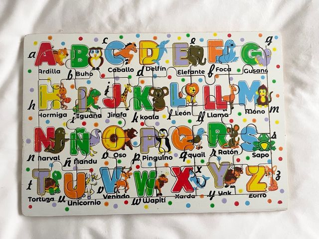 Dettagli del prodottoPuzzle educativo con l'alfabeto spagnolo e animali illustrati, ideale per l'apprendimento.